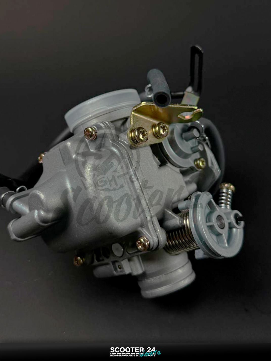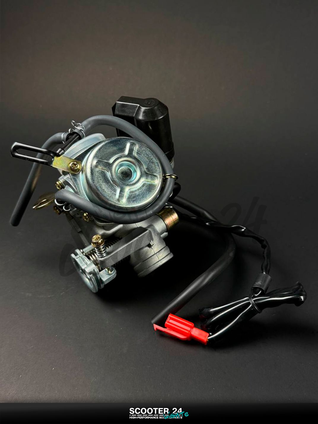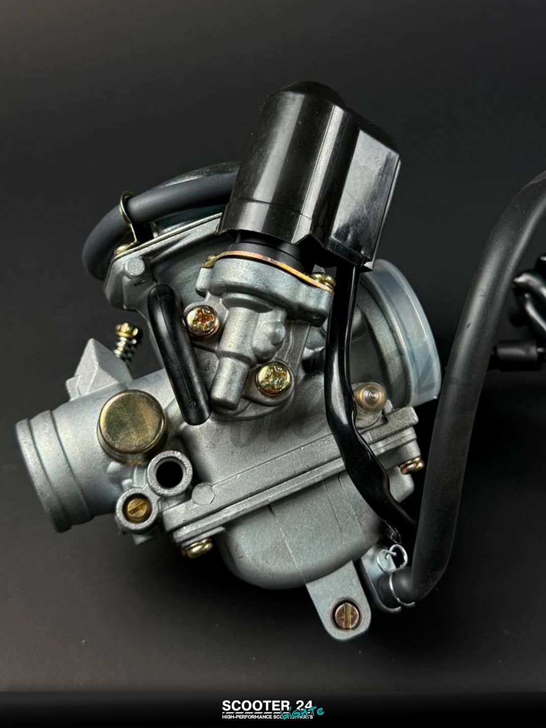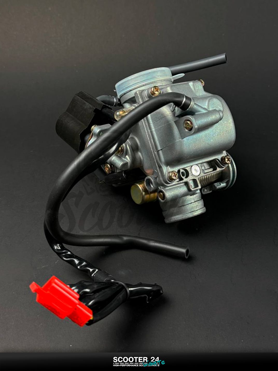 Карбюратор PD24J для 4‑тактных скутеров GY6 125/150 (двигатели 152QMI/157QMJ) — штатный диаметр диффузора 24 мм, автоподсос 12 В (2‑контактный), вакуумный штуцер под кран, ускорительный насос и топливный штуцер под шланг 6–8 мм. Конструкция CV (мембранная) обеспечивает ровную тягу с низов, легкий холодный запуск и стабильный холостой ход, сохраняя экономичность в городе и на трассе. Совместим со штатным резиновым впускным коллектором и гофрой воздушного фильтра GY6 125/150 — монтаж без доработок.